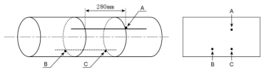 去掉定位纸,从点C开始,在所划直线上量出安装距离L,从而 决定出B点。这样A、B两点为安装位置;例如L=280mm,将球阀底座 分别焊接在A和B两点上。