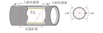 V法是比较标准的安装方法,使用方便,测量准确,安装时两传感器水平对齐,其中心线与管道轴线水平即可。