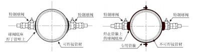 对于可焊接管材(如钢、不锈钢等)将球阀底座直接焊在管道外壁上(不锈钢管需不锈钢底座,定货时请注明)。焊接时注意一定不要夹杂气孔,以防漏水,甚至断裂。