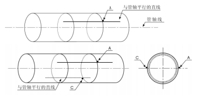 延长定位纸上的直线在管道上划一直线,所划直线与定位纸一 边缘相交点为A;从A点开始,沿着定位纸边边缘量出管道1/2周 长,该平行交叉点为C,在C点划一条与管轴平行的直线(也就是与 定位纸上的直线平行);