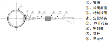 将开孔器密封护套与特制球阀外螺纹连接,拧紧后,打开球 阀,推动钻杆直至与管道外壁接触,将手电钻与钻杆接好锁紧,接通电源,开始钻孔,在钻孔过程中电钻保持低速转速不要过快,以免卡钻,甚至钻头折断,钻透后,拔出钻杆直到开孔器钻头的最前 端退至球阀芯后,关上球阀,卸下开孔器。